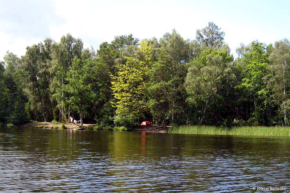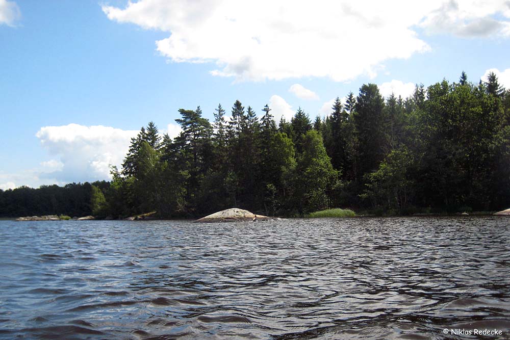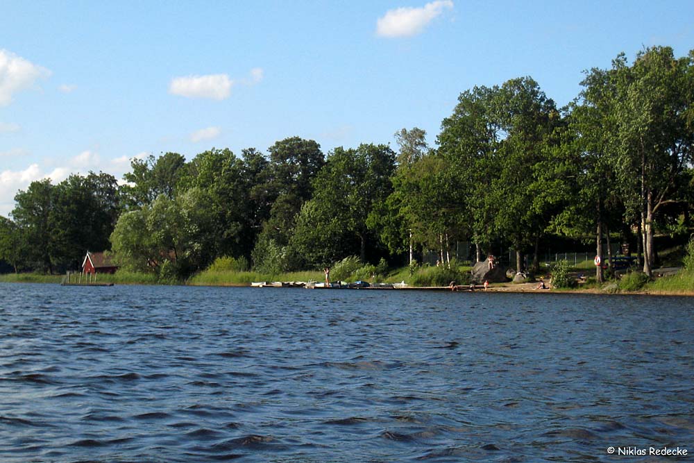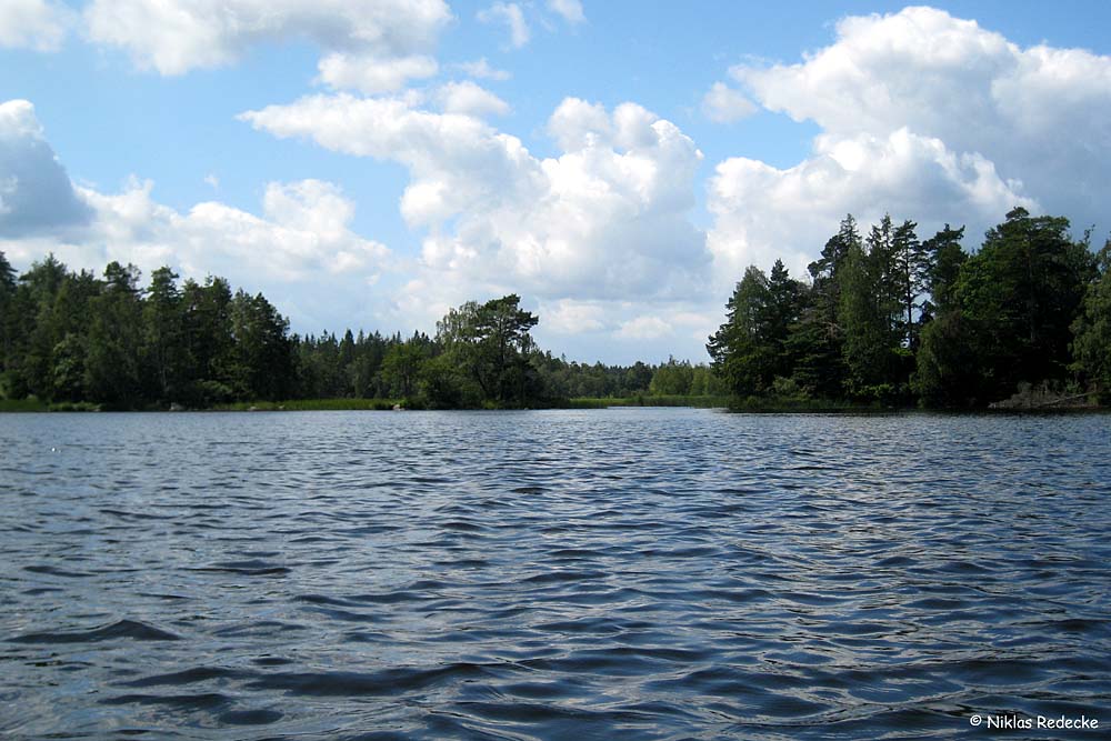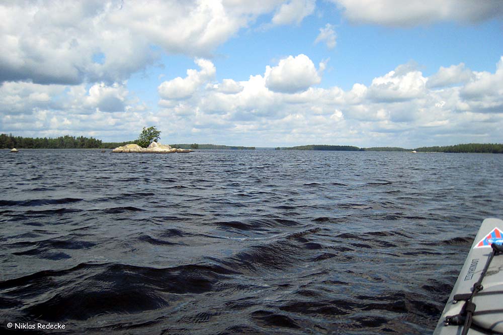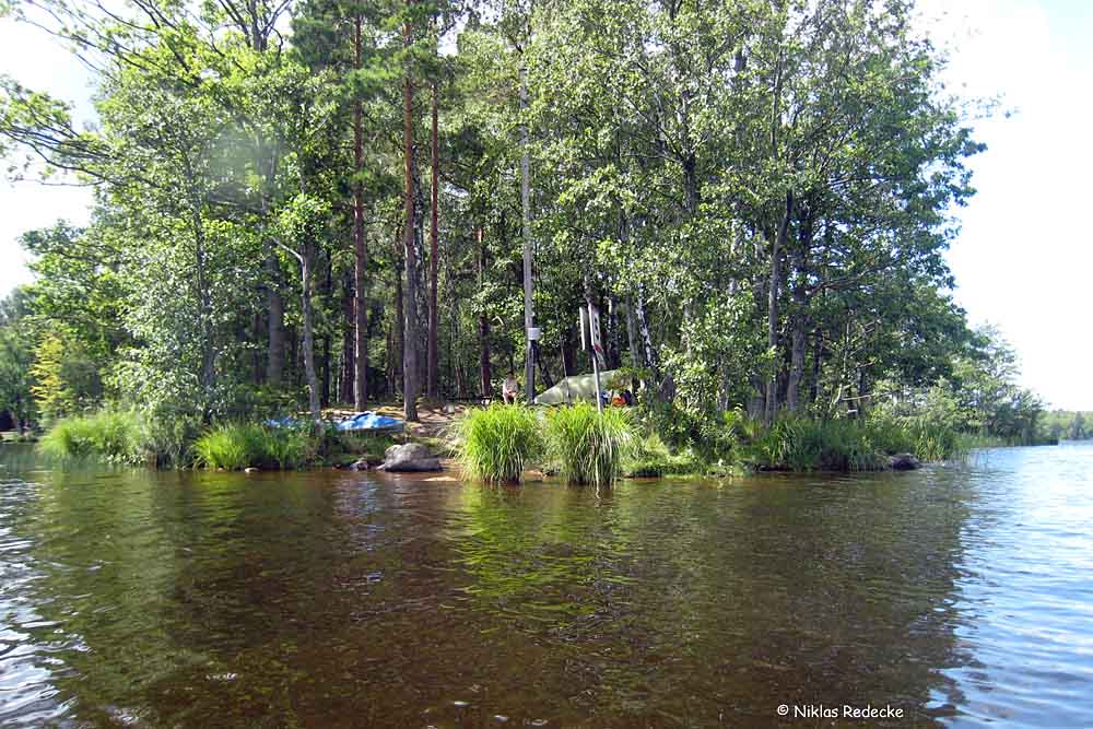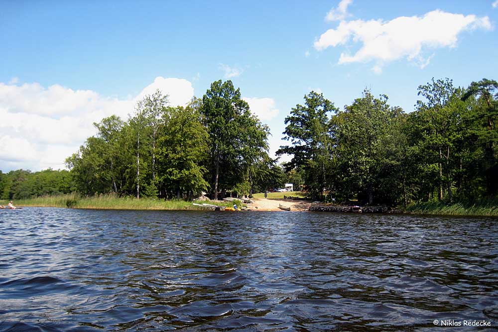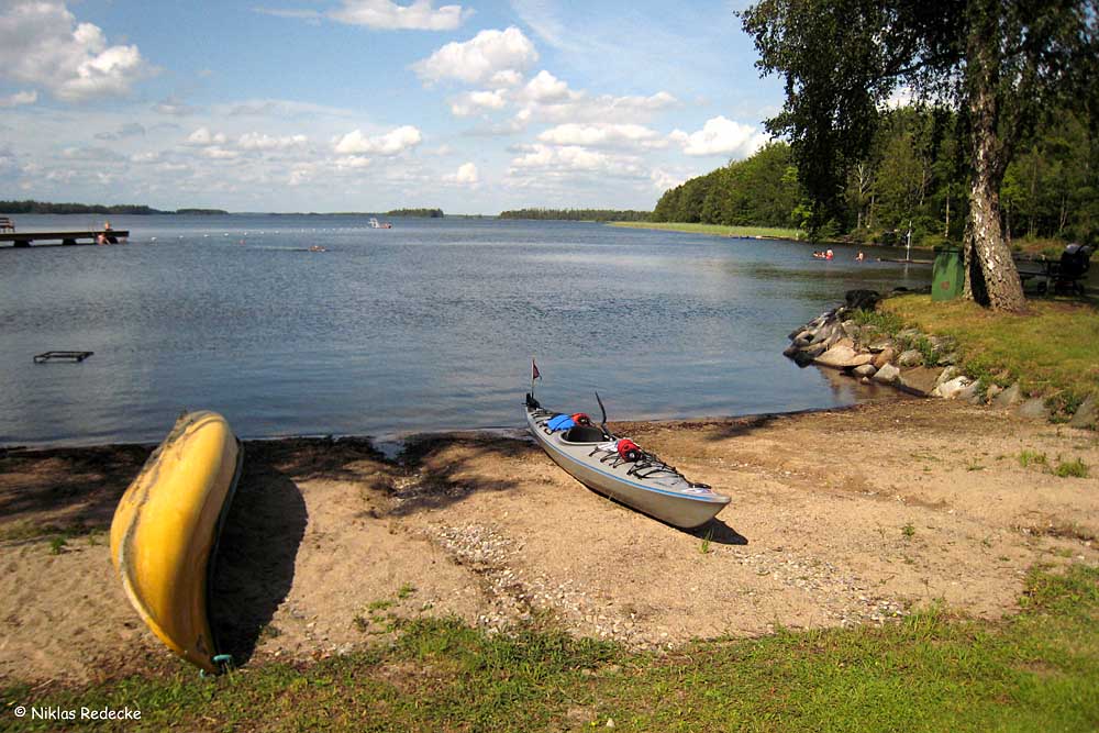 Åsnen, der zweitgrößte See von Småland liegt 30 km südlich von Växjö und rund 100 km westlich von Kalmar; damit ist er aus Deutschland noch gut erreichbar. Der See ist durch große und kleine Inseln, zahlreiche Buchten und Arme stark gegliedert. Für unseren Aufenthalt am Åsnen haben wir den Campingplatz Getnö Gård ausgewählt, den wir zufällig während einer früheren Reise kennen gelernt haben. Getnö ist ein 15 km² großes privates Naturschutzgebiet im Herzen des Sees Åsnen und gehört zu einer der größten Inseln des 155 km² großen Sees. Auf diesem ehemaligen Gutshof, der 1320 erstmals erwähnt wurde, hat sich die Familie Olsson ein kleines Paradies geschaffen. Mit seiner einzigartigen Flora und Fauna bietet Getnö eine Vielzahl von Möglichkeiten der Natur nahe zu kommen. Getnö Gård hat einen naturbelassenen Campingplatz mit 150 Stellplätzen für Wohnwagen, Wohnmobile oder Zelte. Viele davon mitten in der Natur unter Bäumen oder auf kleineren Wiesen. Der Campingplatz liegt direkt am Wasser und verfügt über einen Sandstrand, Badestege und Bootsanlegestellen. Als Besonderheit möchte ich noch die Feuerstellen nennen. Auf fast allen Stellplätzen findet man alte Lkw-Felgen, die auf Haufen von faustgroßen Kieselsteinen gelagert sind. Abends brennen dann zahlreiche Feuer und sorgen für Gemütlichkeit, sofern man nicht im Qualm vom Nachbarn sitzt. Damit sich niemand an den zahlreichen Bäumen vergreift, wird Feuerholz in Säcken vom Platzbetreiber angeboten. Durch die Lage auf einer Insel, die man nur über eine Brücke erreichen kann, ist der Platz hervorragend als Basisstation für Kanutouren in alle Himmelsrichtungen geeignet. Eine Wasser- und Radwanderkarte im Maßstab 1:50.000 mit dem Åsnen und der näheren Umgebung habe ich an der Rezeption gekauft. Sie ist gut für die Tourenplanung brauchbar, da alle für Kanuten wichtigen Punkte hervorgehoben sind. Ein Koordinaten-Gitter erleichtert den Einsatz von GPS-Geräten. Zum Schutz der reichhaltigen Vogelwelt wurden auf dem Åsnen zahlreiche Inseln und Nistgebiete unter Vogelschutz gestellt. Damit die Brut und Aufzucht der Jungen nicht durch Kanuten gestört werden, besteht ein Zutrittsverbot in der Zeit vom 1. April bis zum 15. Juli. Diese Gebiete sind mit gelben Schildern gekennzeichnet und auch in den Wasserwanderkarten markiert. Beim Vorbeifahren ist ein gebührender Abstand (möglichst mehr als 100 m) einzuhalten. Die nachfolgend beschriebene Tour bin ich als sportliche Tour solo gepaddelt. Sie war mit 35 km für ein stehendes Gewässer schon recht lang, eine Zwischenübernachtung auf dem Campingplatz Kärrasand wäre aber problemlos möglich. Von der Anlegestelle des Campingplatzes bin ich zunächst in Richtung Norden gepaddelt, um mich rechtzeitig vor Erreichen des Vogelschutzgebietes auf der Insel Södra Aspö nach NO zu wenden und kurze Zeit später die schmale Durchfahrt zwischen den Inseln Sirkön und Getnö zu passieren. An der Nordspitze von Getnö liegt ein lang gezogener Kanurastplatz, der trotz seiner wunderschönen Lage nur schwach besucht war. Linker Hand lasse ich die kleine Insel Lindholmen liegen und fahre auf die Südspitze von Sirkön zu. An Backbord sehe ich noch den Familiencampingplatz Rotahults mit kleinem Sandstrand, bevor ich die Südspitze umrunde und auf die Autobrücke zuhalte, die mit einem langen Damm die Insel Sirkön mit dem Festland verbindet. Unter der Brücke her paddele ich in den östlichen Teil des Åsnen und setze meinen Weg entlang des rechten Ufers für ca. 2 km fort, bevor ich nach rechts in den Fårarmsund einbiege. Nach 1,5 km lasse ich die Insel Mossö rechts liegen und fahre in Richtung SSO auf den Aussichtspunkt Lunnabacken zu. Nach einigem Suchen finde ich auch eine Stelle, wo ich aussteigen und mein Boot für eine Besichtigung des Aussichtspunktes Lunnabacken mit Heimatmuseum und des Schaugartens Korrebo zurücklassen kann. Lunnabacken bietet einen weiten Ausblick über den See Åsnen. Die Kuppe des Hügels liegt 187 m über dem Meeresspiegel und 48 m über dem See. Auf dem Hügel liegt das Heimatmuseum von Urshult mit dem ältesten Gebäude der Gemeinde aus dem Jahr 1909. Der Schaugarten Kurrebo gilt als Kronobergs schönster Garten. Hier kann man herumspazieren und die schönen Anlagen mit rund 1.000 verschiedenen Arten von Stauden, Rosen, Kletterpflanzen, Nadelgehölzen, Büschen und Bäumen genießen. Im Geschäft werden Pflanzen, Samen und verschiedene andere Gartenprodukte verkauft. Im Hinblick auf die Transportkapazität meines Bootes ist die Versuchung gering, mich hier einzudecken. In Kurrebo zeigen auch Gärtnereibetriebe ihre Produkte, hier befindet sich u.a. ein Schaugewächshaus. Der Schaugarten Kurrebo bietet auch eine bezaubernde Aussicht über den See Åsnen, und die Umgebung ist bekannt für ihr sehr schönes Biotop. Kurrebo liegt mitten im småländischen Apfelanbaugebiets, wo man die Apfelplantage “Eden” besichtigen kann, die als Wiesenobstplantage Anfang dieses Jahrhunderts angelegt wurde. Im Café Kurrebo habe ich mir erst einmal Kaffee mit selbstgebackenem Kuchen geholt und mir auf der Terrasse eine Kaffeepause mit Blick auf den See gegönnt. Wer möchte kann hier auch in einem der neun Betten des Vandrarhem übernachten. Dieser Platz ist so schön und der Aufenthalt reinster Balsam für meine Seele; der Abschied fällt mir wirklich schwer. Zurück im Boot wende ich mich nach links und folge dem Ufer bis zum Campingplatz Kärrasand. Ich checke diesen kurz für spätere Touren und folge dem Uferverlauf weiter, bis ich den Fårarmsund wieder erreiche. Bis zur Südspitze der Insel Sirkön paddele ich nun den Hinweg in umgekehrter Richtung, setze meine Fahrt dann aber in Richtung SSW noch drei Kilometer fort, bis ich an der Südspitze der Insel Igelön vorbei gezogen bin und den Kanurastplatz am linken Ufer entdecke. Nun wende ich mich nach Westen und halte auf den Damm zu, der die Insel Getnö mit dem Festland verbindet. Vorsichtig paddele