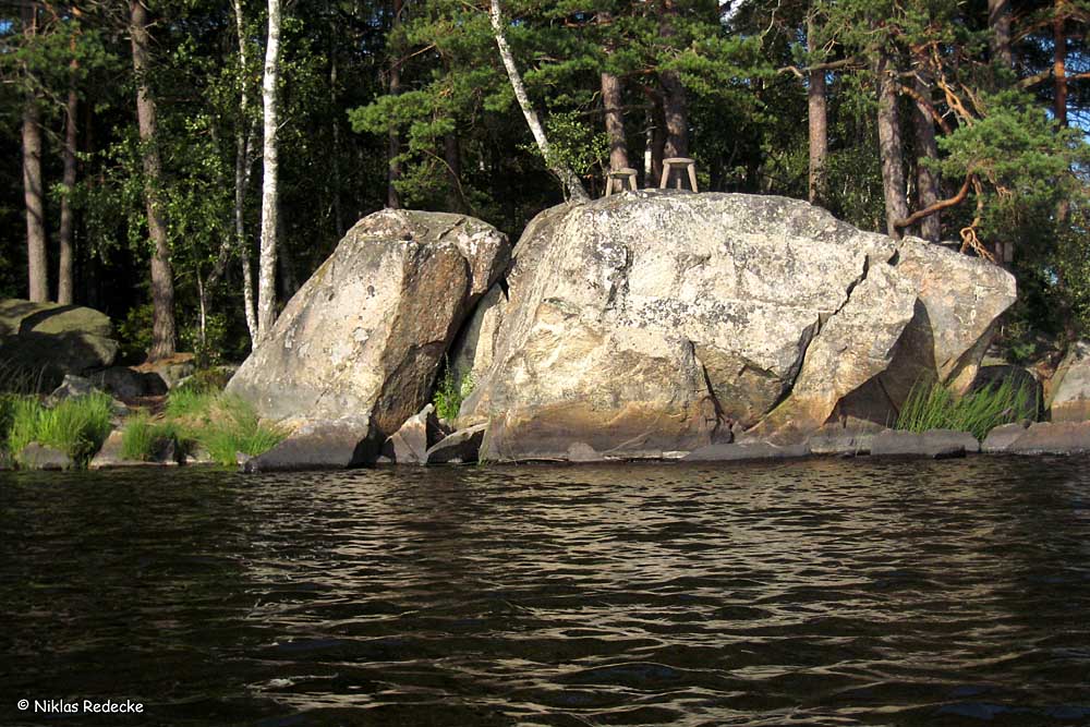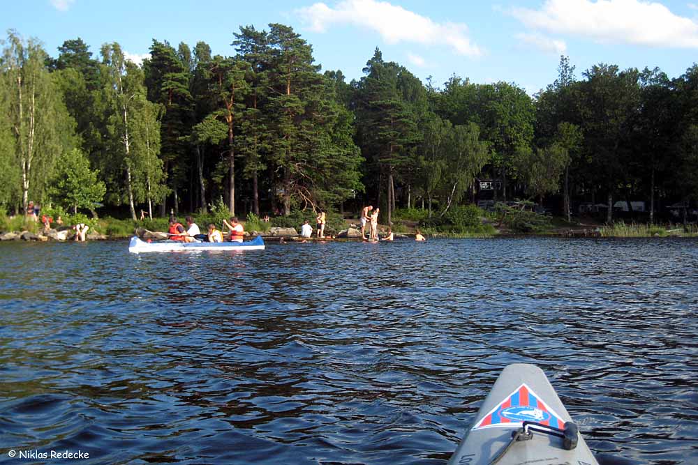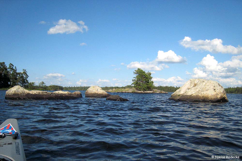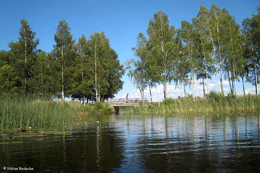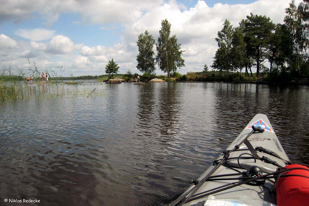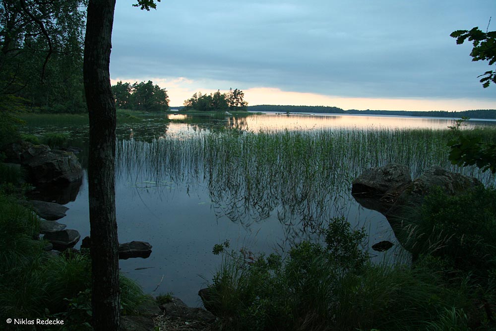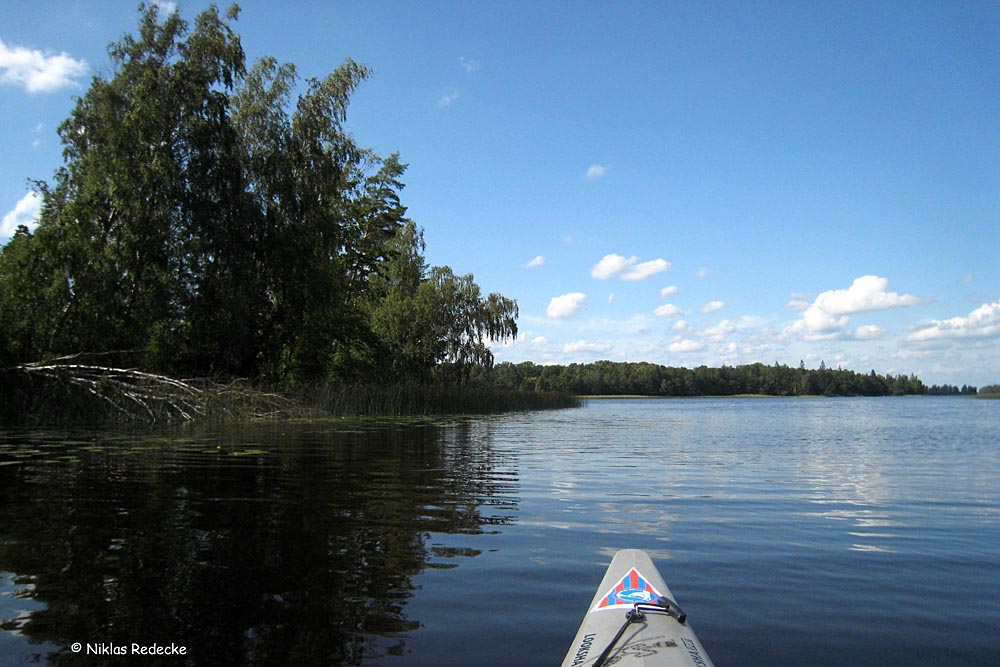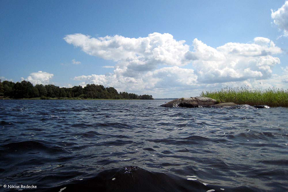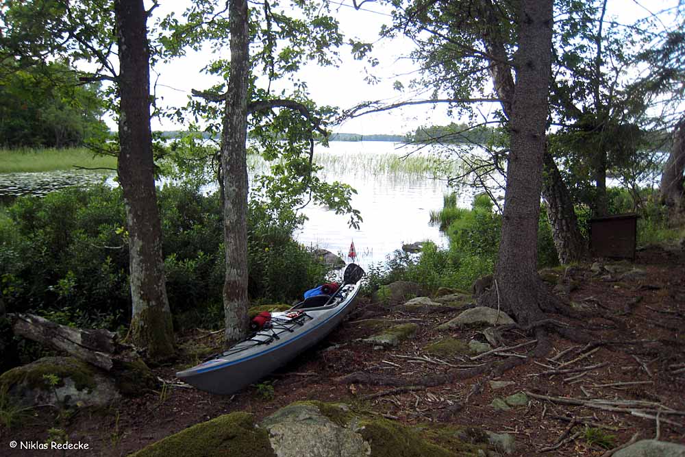 Åsnen, der zweitgrößte See von Småland liegt 30 km südlich von Växjö und rund 100 km westlich von Kalmar; damit ist er aus Deutschland noch gut erreichbar. Der See ist durch große und kleine Inseln, zahlreiche Buchten und Arme stark gegliedert. Für unseren Aufenthalt am Åsnen haben wir den Campingplatz Getnö Gård ausgewählt, den wir zufällig während einer früheren Reise kennen gelernt haben. Getnö ist ein 15 km² großes privates Naturschutzgebiet im Herzen des Sees Åsnen und gehört zu einer der größten Inseln des 155 km² großen Sees. Auf diesem ehemaligen Gutshof, der 1320 erstmals erwähnt wurde, hat sich die Familie Olsson ein kleines Paradies geschaffen. Mit seiner einzigartigen Flora und Fauna bietet Getnö eine Vielzahl von Möglichkeiten der Natur nahe zu kommen. Getnö Gård hat einen naturbelassenen Campingplatz mit 150 Stellplätzen für Wohnwagen, Wohnmobile oder Zelte. Viele davon mitten in der Natur unter Bäumen oder auf kleineren Wiesen. Der Campingplatz liegt direkt am Wasser und verfügt über einen Sandstrand, Badestege und Bootsanlegestellen. Als Besonderheit möchte ich noch die Feuerstellen nennen. Auf fast allen Stellplätzen findet man alte Lkw-Felgen, die auf Haufen von faustgroßen Kieselsteinen gelagert sind. Abends brennen dann zahlreiche Feuer und sorgen für Gemütlichkeit, sofern man nicht im Qualm vom Nachbarn sitzt. Damit sich niemand an den zahlreichen Bäumen vergreift, wird Feuerholz in Säcken vom Platzbetreiber angeboten. Durch die Lage auf einer Insel, die man nur über eine Brücke erreichen kann, ist der Platz hervorragend als Basisstation für Kanutouren in alle Himmelsrichtungen geeignet. Eine Wasser- und Radwanderkarte im Maßstab 1:50.000 mit dem Åsnen und der näheren Umgebung habe ich an der Rezeption gekauft. Sie ist gut für die Tourenplanung brauchbar, da alle für Kanuten wichtigen Punkte hervorgehoben sind. Ein Koordinaten-Gitter erleichtert den Einsatz von GPS-Geräten. Zum Schutz der reichhaltigen Vogelwelt wurden auf dem Åsnen zahlreiche Inseln und Nistgebiete unter Vogelschutz gestellt. Damit die Brut und Aufzucht der Jungen nicht durch Kanuten gestört werden, besteht ein Zutrittsverbot in der Zeit vom 1. April bis zum 15. Juli. Diese Gebiete sind mit gelben Schildern gekennzeichnet und auch in den Wasserwanderkarten markiert. Beim Vorbeifahren ist ein gebührender Abstand (möglichst mehr als 100 m) einzuhalten. Die nachfolgend beschriebene Tour bin ich als sportliche Tour solo gepaddelt. Sie war mit 35 km für ein stehendes Gewässer schon recht lang, eine Zwischenübernachtung auf dem Campingplatz Kärrasand wäre aber problemlos möglich. Von der Anlegestelle des Campingplatzes bin ich zunächst in Richtung Norden gepaddelt, um mich rechtzeitig vor Erreichen des Vogelschutzgebietes auf der Insel Södra Aspö nach NO zu wenden und kurze Zeit später die schmale Durchfahrt zwischen den Inseln Sirkön und Getnö zu passieren. An der Nordspitze von Getnö liegt ein lang gezogener Kanurastplatz, der trotz seiner wunderschönen Lage nur schwach besucht war. Linker Hand lasse ich die kleine Insel Lindholmen liegen und fahre auf die Südspitze von Sirkön zu. An Backbord sehe ich noch den Familiencampingplatz Rotahults mit kleinem Sandstrand, bevor ich die Südspitze umrunde und auf die Autobrücke zuhalte, die mit einem langen Damm die Insel Sirkön mit dem Festland verbindet. Unter der Brücke her paddele ich in den östlichen Teil des Åsnen und setze meinen Weg entlang des rechten Ufers für ca. 2 km fort, bevor ich nach rechts in den Fårarmsund einbiege. Nach 1,5 km lasse ich die Insel Mossö rechts liegen und fahre in Richtung SSO auf den Aussichtspunkt Lunnabacken zu. Nach einigem Suchen finde ich auch eine Stelle, wo ich aussteigen und mein Boot für eine Besichtigung des Aussichtspunktes Lunnabacken mit Heimatmuseum und des Schaugartens Korrebo zurücklassen kann. Lunnabacken bietet einen weiten Ausblick über den See Åsnen. Die Kuppe des Hügels liegt 187 m über dem Meeresspiegel und 48 m über dem See. Auf dem Hügel liegt das Heimatmuseum von Urshult mit dem ältesten Gebäude der Gemeinde aus dem Jahr 1909. Der Schaugarten Kurrebo gilt als Kronobergs schönster Garten. Hier kann man herumspazieren und die schönen Anlagen mit rund 1.000 verschiedenen Arten von Stauden, Rosen, Kletterpflanzen, Nadelgehölzen, Büschen und Bäumen genießen. Im Geschäft werden Pflanzen, Samen und verschiedene andere Gartenprodukte verkauft. Im Hinblick auf die Transportkapazität meines Bootes ist die Versuchung gering, mich hier einzudecken. In Kurrebo zeigen auch Gärtnereibetriebe ihre Produkte, hier befindet sich u.a. ein Schaugewächshaus. Der Schaugarten Kurrebo bietet auch eine bezaubernde Aussicht über den See Åsnen, und die Umgebung ist bekannt für ihr sehr schönes Biotop. Kurrebo liegt mitten im småländischen Apfelanbaugebiets, wo man die Apfelplantage “Eden” besichtigen kann, die als Wiesenobstplantage Anfang dieses Jahrhunderts angelegt wurde. Im Café Kurrebo habe ich mir erst einmal Kaffee mit selbstgebackenem Kuchen geholt und mir auf der Terrasse eine Kaffeepause mit Blick auf den See gegönnt. Wer möchte kann hier auch in einem der neun Betten des Vandrarhem übernachten. Dieser Platz ist so schön und der Aufenthalt reinster Balsam für meine Seele; der Abschied fällt mir wirklich schwer. Zurück im Boot wende ich mich nach links und folge dem Ufer bis zum Campingplatz Kärrasand. Ich checke diesen kurz für spätere Touren und folge dem Uferverlauf weiter, bis ich den Fårarmsund wieder erreiche. Bis zur Südspitze der Insel Sirkön paddele ich nun den Hinweg in umgekehrter Richtung, setze meine Fahrt dann aber in Richtung SSW noch drei Kilometer fort, bis ich an der Südspitze der Insel Igelön vorbei gezogen bin und den Kanurastplatz am linken Ufer entdecke. Nun wende ich mich nach Westen und halte auf den Damm zu, der die Insel Getnö mit dem Festland verbindet. Vorsichtig paddele