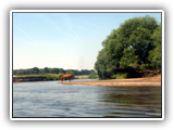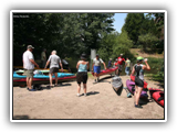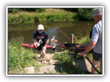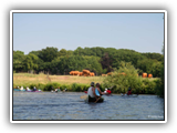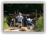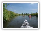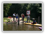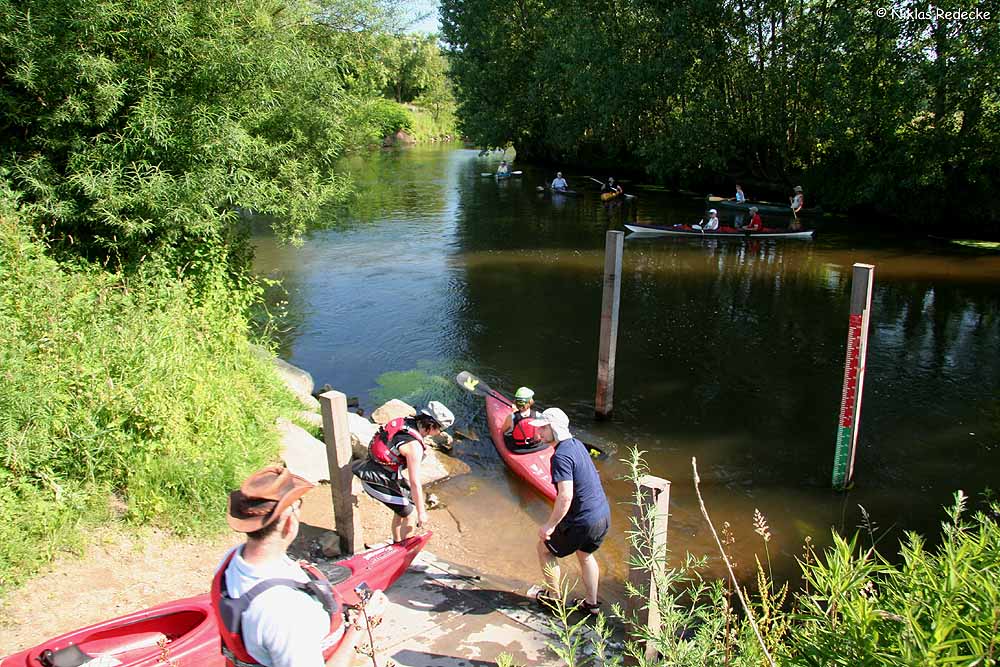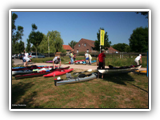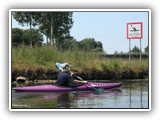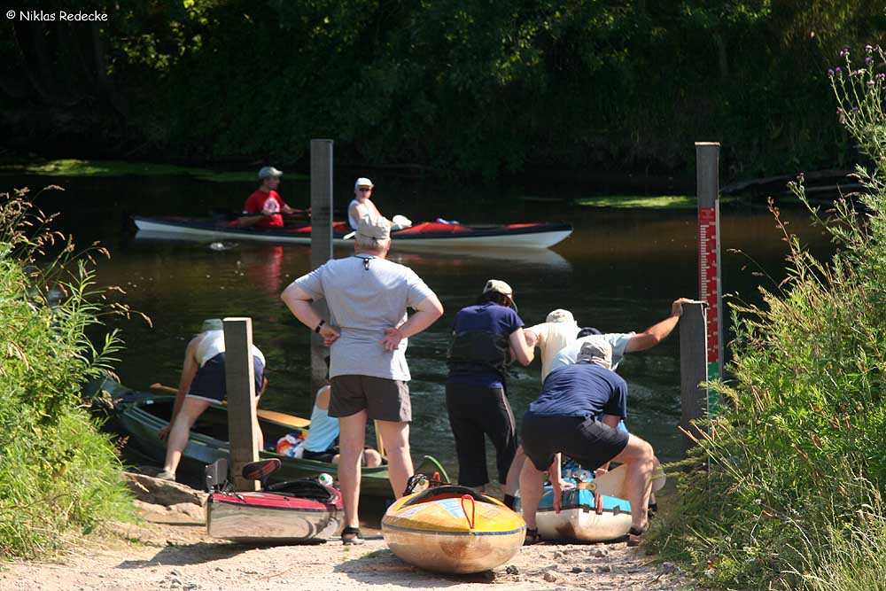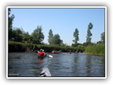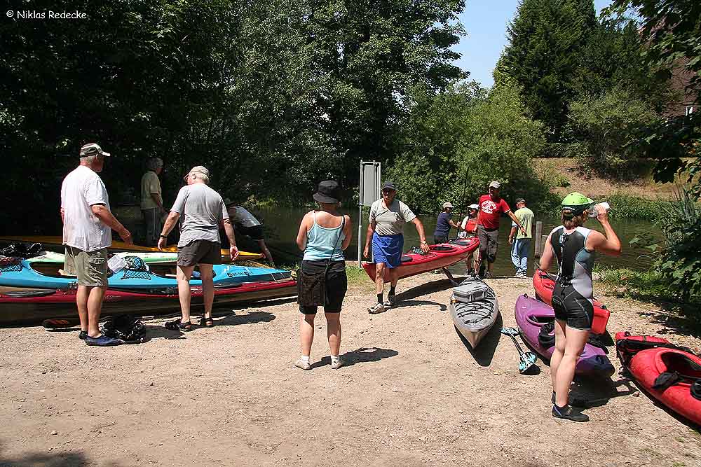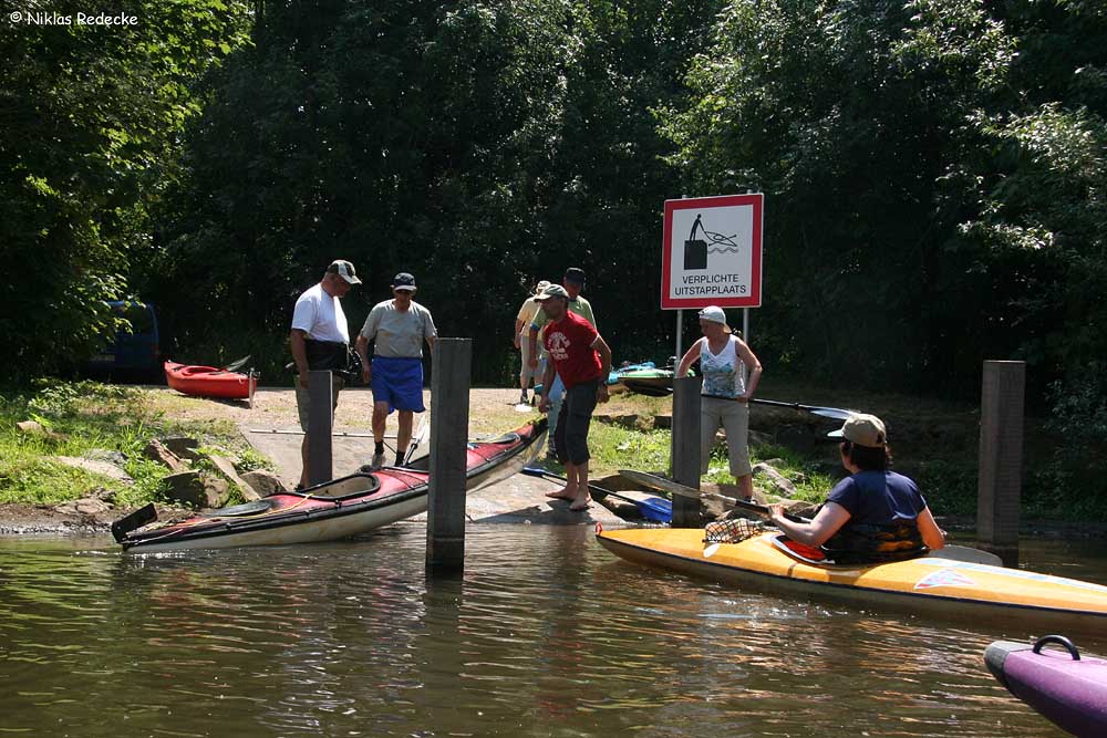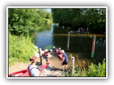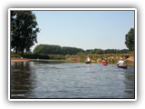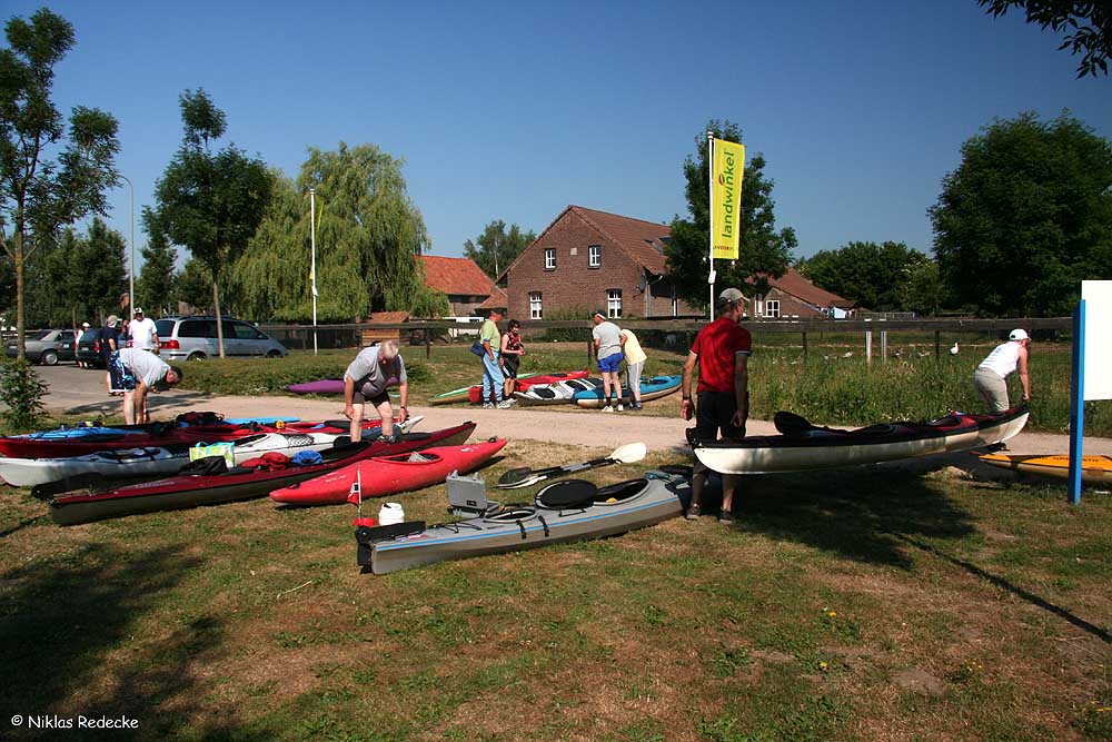 Die Roer ist der ca. 22 km lange Abschnitt der Rur, der auf niederländischem Staatsbebiet verläuft. Des öfteren bin ich schon auf der Rur gepaddelt, so z.B. von Gut Reichenstein bis Widdau, von Heimbach bis Obermaubach oder von Linnich bis Orsbeck, aber noch nie auf dem letzten Stück jenseits der Niederländischen Grenze. Da ich in solchen Fällen gerne neugierig bin, habe ich mich von der Genehmigungspflicht für diesen Abschnitt nicht abschrecken lassen. Nach einiger Internet-Recherche fand ich heraus, dass für die Zeit vom 1. Juni bis zum 1. Oktober eines jeden Jahres Genehmigungen für täglich bis zu 2 mal 20 Boote erteilt werden, wovon die erste Hälte um 10 Uhr und die andere Häfte um 14 Uhr starten muss. Mit ein wenig niederländischen Sprachkenntnissen kann man die Genehmigung leicht online bei der waterschap Roer en Overmaas beantragen. Gebühren fallen dabei nicht an. Mir ist es zumindest gelungen, eine Genehmigung für eine Kanufahrt mit 20 Booten am 27. Juni 2010 um 10 Uhr zu bekommen. Die Tour hatte ich im KWC Grefrath 1983 e.V. als Vereinsfahrt ausgeschrieben; zusätzlich habe ich noch ein paar Freunde und Bekannte eingeladen, uns zu begleiten. Trotz des guten Wetters waren wir dann aber “nur” mit 17 Kanuten am Start. Wegen des um 16:00 beginnenden Fussballspiels (Weltmeisterschaft in Südafrika - Deutschland gegen England im Achtel-Finale) haben wir leider keine 20 Boote aufs Wasser gebracht. Auf dem Weg zum Start haben wir zwei leere Autos am Ziel in Roermond (im Navi “Maastrichter Weg, Roermond” eingeben; die Aussatzstelle liegt zwischen der Roer und der Shell-Tankstelle) abgestellt. Die Einsatzstelle (fürs Navi: Tussen de Bruggen, Vlodrop) liegt an einem Parkplatz direkt neben einem Bauernhofcafé/Hofladen. Das Einsetzen nahm einige Zeit in Anspruch, da es immerhin 14 Boote an den etwas hinderlichen vier Pfählen vorbei mussten. Zudem sollte die Gruppe ja eng beieinander bleiben, um die Störung der Natur so gering wie möglich zu halten.