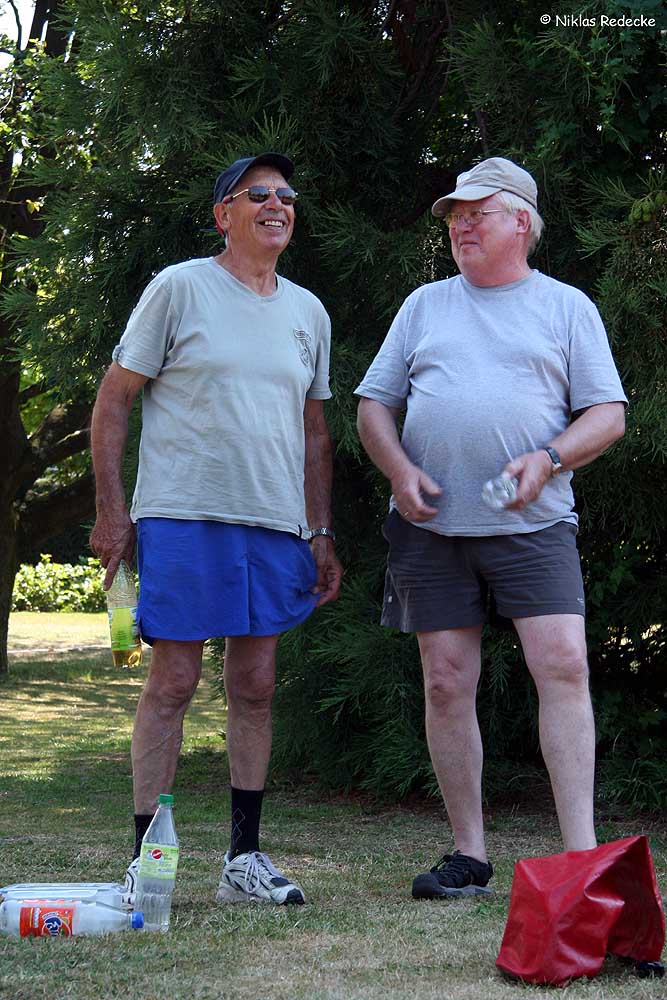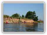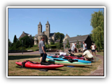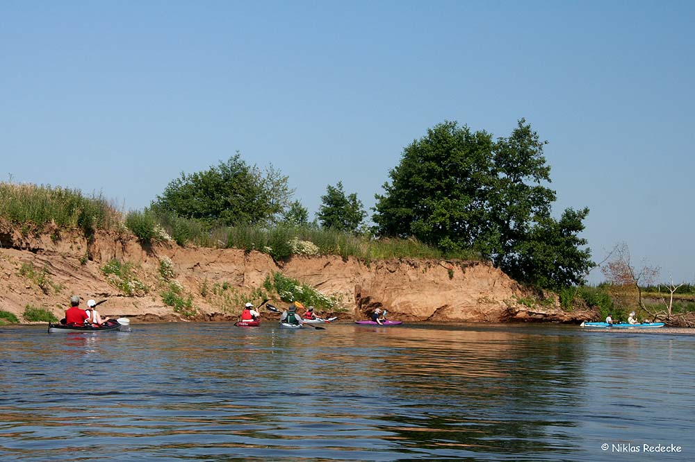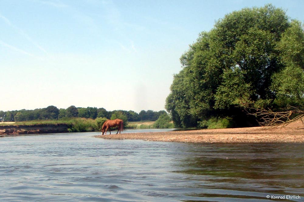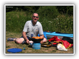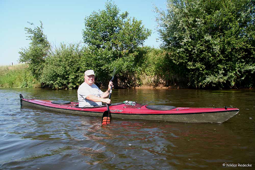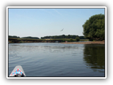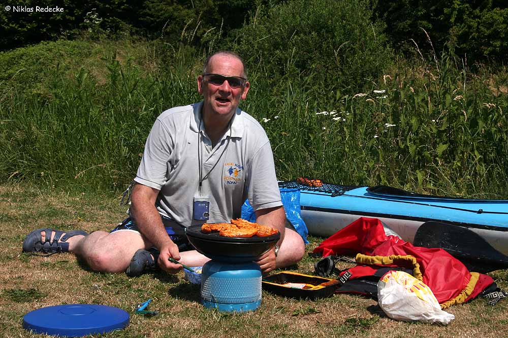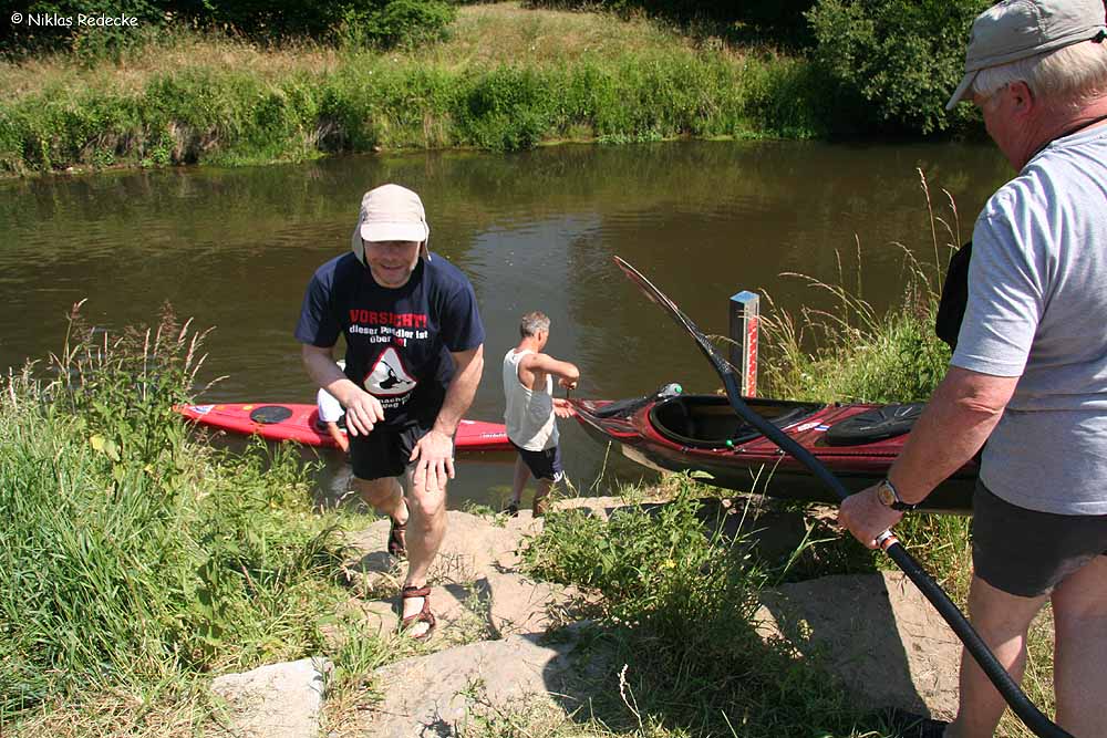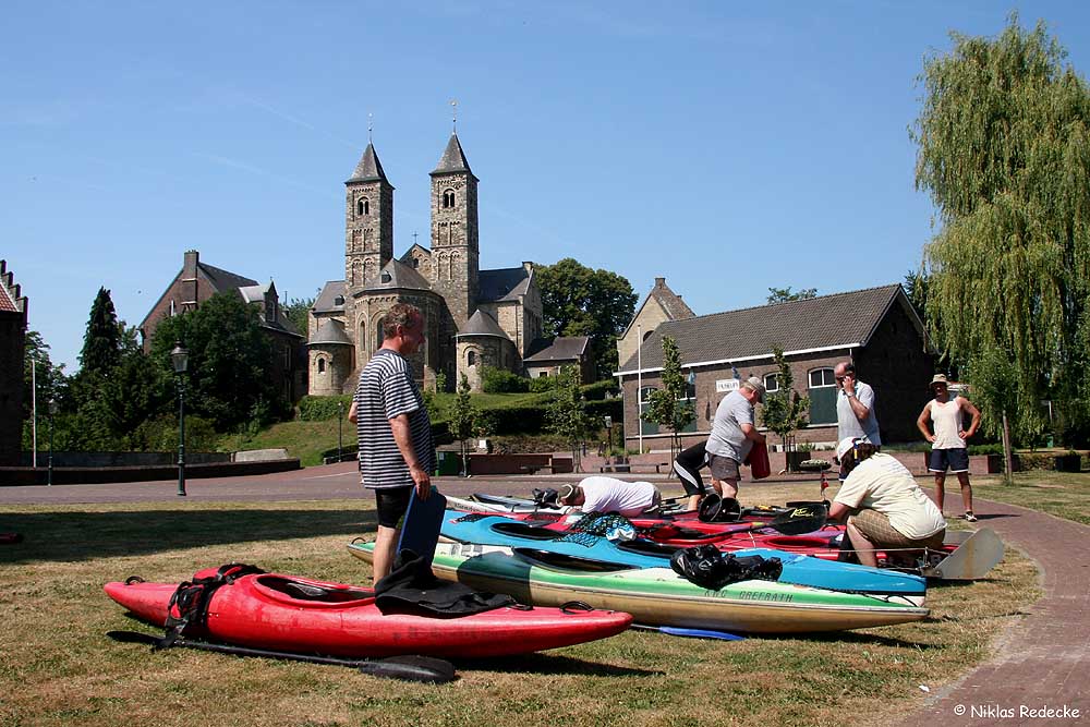 Unterwegs auf dem Wasser bestätigte sich dann, was wir erwartet hatten: schöne Paddelei auf einem naturnahen Fluss, der in vielen Kurven durch Wald und Wiesen mäandert. Die Uferbeschaffenheit wechselt häufig von Abbruchkanten mit sandigen Steilufern, Kiesbänken, Wiesen, Wald und ins Wasser ragenden Büschen und Bäumen. Die Strömung war trotz des niedrigen Wasserstands gut spürbar; Wassertiefe und Flussbreite wechselten ebenfalls häufig. Vorausschauendes Paddeln war auch wegen einiger im Wasser liegender Äste und Bäume ratsam; ein Baumhindernis versperrte fast den ganzen Fluss und konnte nur vorsichtig am linken Ufer passiert werden. Etwa nach der halben Strecke erreichten wir den einzigen zulässigen Pausenplatz an der Kirche in St. Odilienberg. Das Aussteigen ist hier etwas beschwerlich, da das Ufer sehr steil und mit Steinstufen für Riesen versehen ist. Bei der gleißenden Sonne waren wir froh, dass einige Bäume Schatten spendeten. Konrad nutzte die Zeit zum Grillen auf dem Gasgrill, andere vertraten sich die Beine bei einem kleinen Ortsrundgang. Nach der Pause ließen wir uns erst einmal treiben, weil ein Teilnehmer seinen Hut am Pausenplatz vergessen hatte. Die Landschaft wurde nun etwas offener. Schwäne waren mit ihren Jungen unterwegs und Pferde kamen auf den Sandbänken bis ans Wasser. Scheller als wir erwartet hatten, näherten wir uns Roermond mit einigen malerischen Gärten. An der Flussteilung (links geht eine gesperrte Fischtreppe ab) wurden wir auf das baldige Ende der Tour hingewiesen. Zwischen Eisenbahnbrücke und Strassenbrücke liegt die Aussatzstelle am linken Ufer. Das Tor der Zufahrt war nicht gesperrt und ermöglichte uns ein bequemes Verladen der Boote, nachdem wir die Autos nachgeholt hatten. Es war eine Kanutour, die ich gerne wiederholen möchte, und es war noch nicht vorbei: Auf dem Rückweg hörten wir, wie Sebastian Vettel den “Großen Preis von Europa” gewann und wir waren noch zeitig genug zu Hause, um die zweite Halbzeit beim 4:1 gegen England zu sehen. Eine wunderbare Sommertag klang dann mit abendlichem Grillen aus. Das ist nicht mehr zu toppen!!! Weitere Bilder und Videos von der Tour gibt es unter: Fotos von Konrad Video von Michael